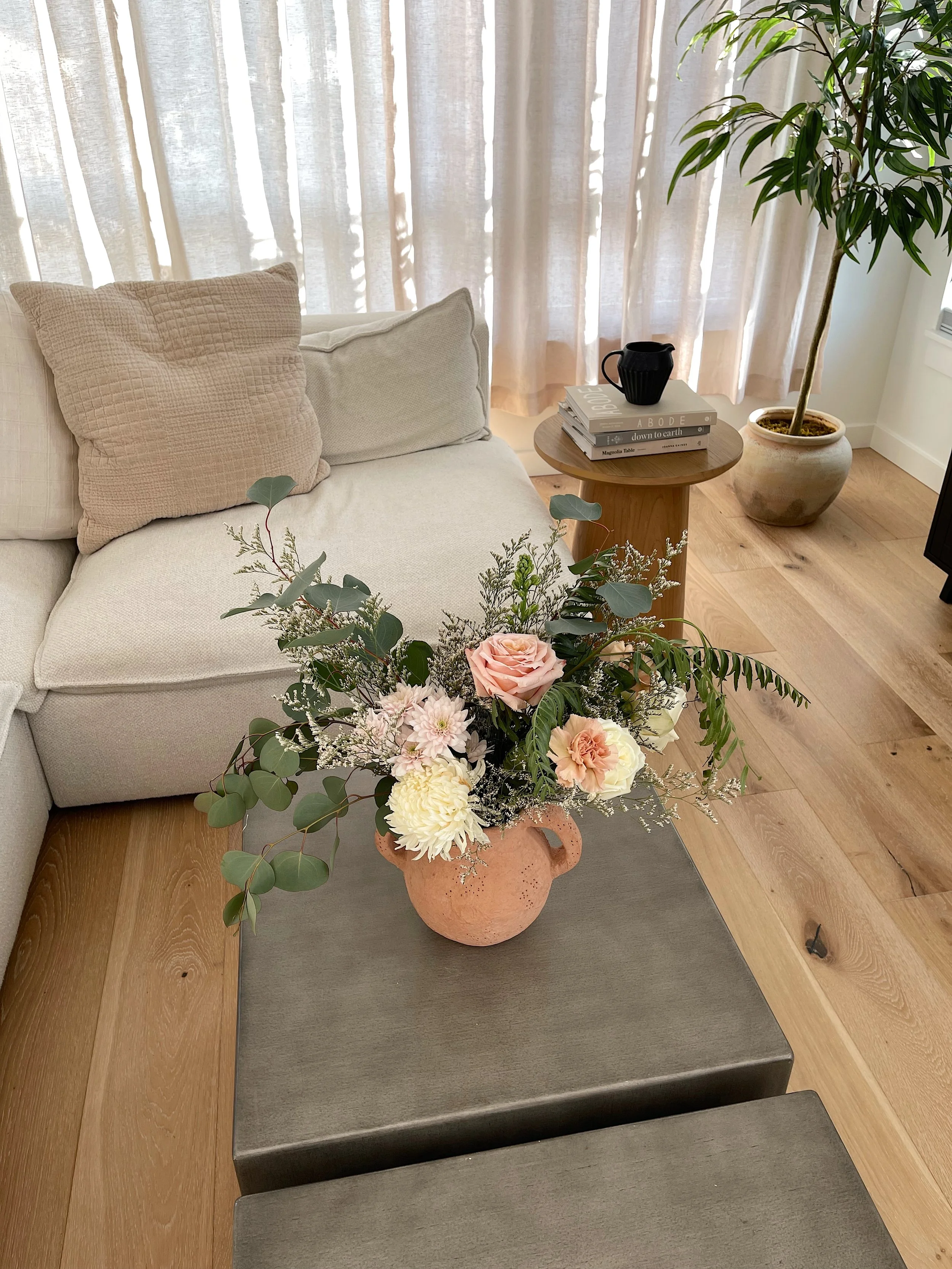Decor - Most of the pillows are from Target & Pottery Barn. The wooden side table is a Target find under $100. I love that it matches the flooring and just blends in with the space nicely. It is super sturdy and looks expensive. The faux eucalyptus tree in the corner is part of the studio McGee collection at target. It is $180 which is maybe a little bit pricey for a faux plant, but it is honestly beautiful. I just love the way that it looks so natural and real. I find most of our decoration pieces from Target and Amazon. I also have recently been loving Etsy to find more unique pieces like the vase and checkered coasters!