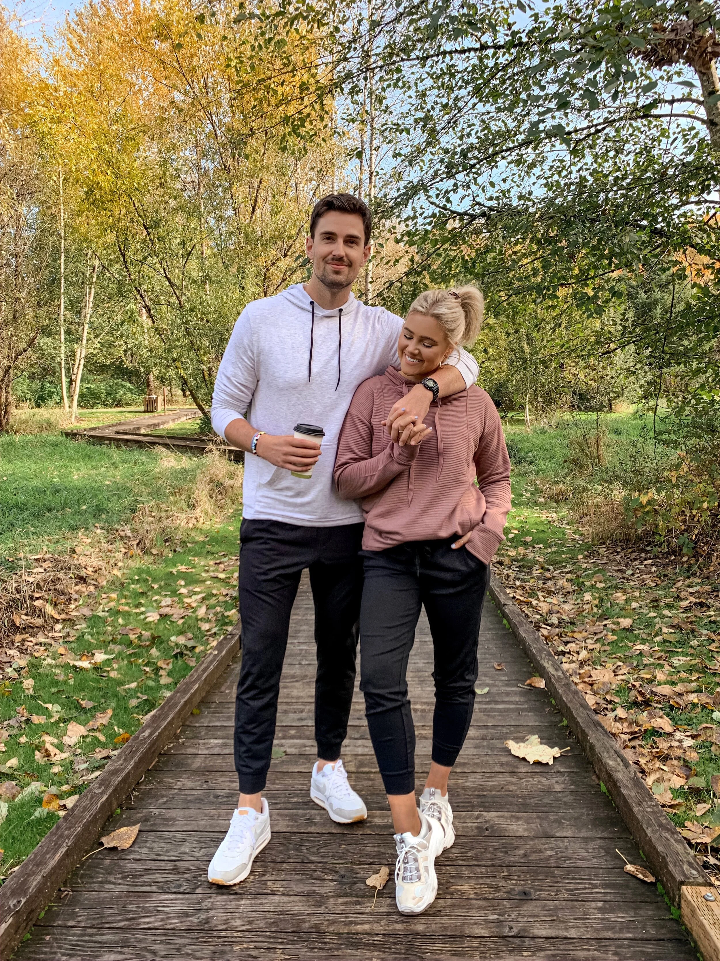 There is really nothing better than being in cozies and going on a walk in the Fall together! Can this time of year just last forever? But let’s be honest.. whether it’s to the gym, lounging around the house, or being active outside, it always feel good to be put together and to wear something that is stylish AND comfy. We are always looking for new athleisure and comfy items to add to our wardrobe that fit this criteria. It can be so hard to find brands that are affordable, stylish and that both Matt and I like. We both have our own sense of style which can make I preeeety hard sometimes to shop at the same places. This was the first time we have ever ordered from or worn Jockey brand clothing! I was really excited when ordering these clothes online because it seemed like everything had really solid reviews. When you’ve never worn a brand before you sort of have to base your choices off of the reviews & size chart and then really hope that everything fits the way it says it will haha! When our Jockey clothes arrived we were super happy with them, and I am already wanting to get another pair of these joggers.